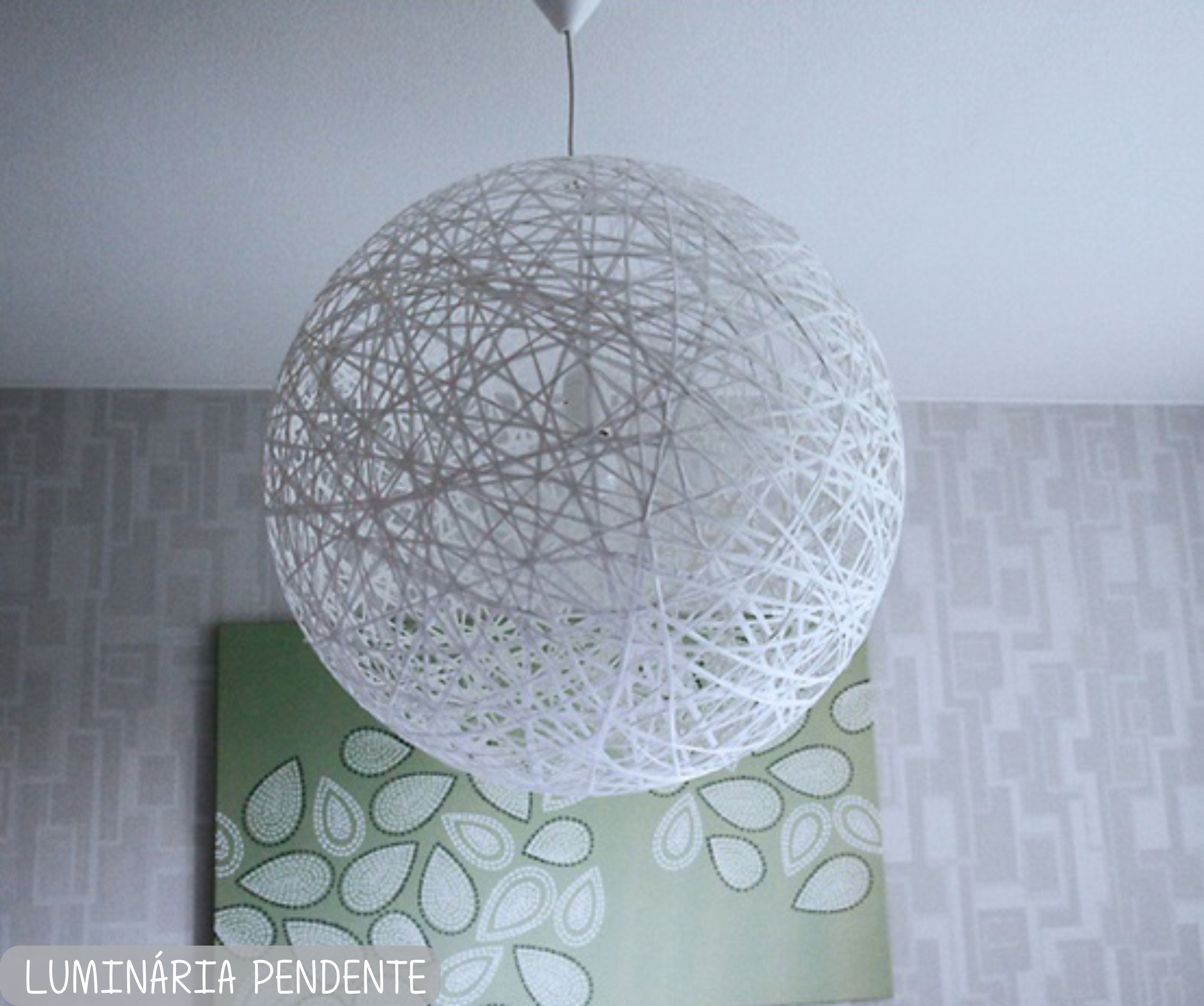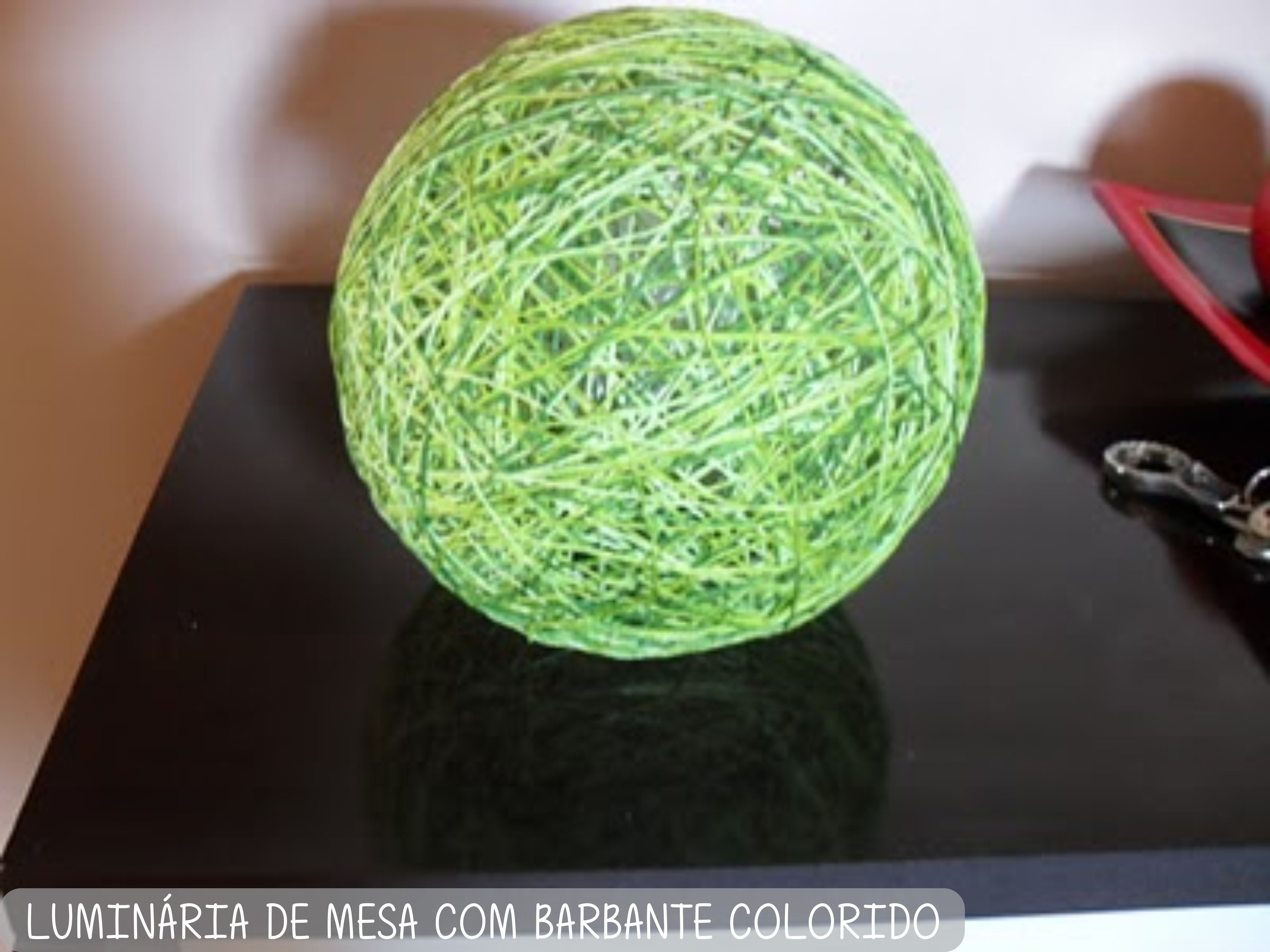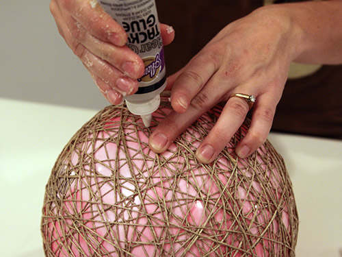 5- Depois de completar o serviço de enrolar o barbante, aguarde a cola secar completamente. Leia a instrução de sua cola, pois isso varia de marca para marca. Depois de seco, utilize o ventil para murchar a bola e retirá-la do centro de sua luminária.