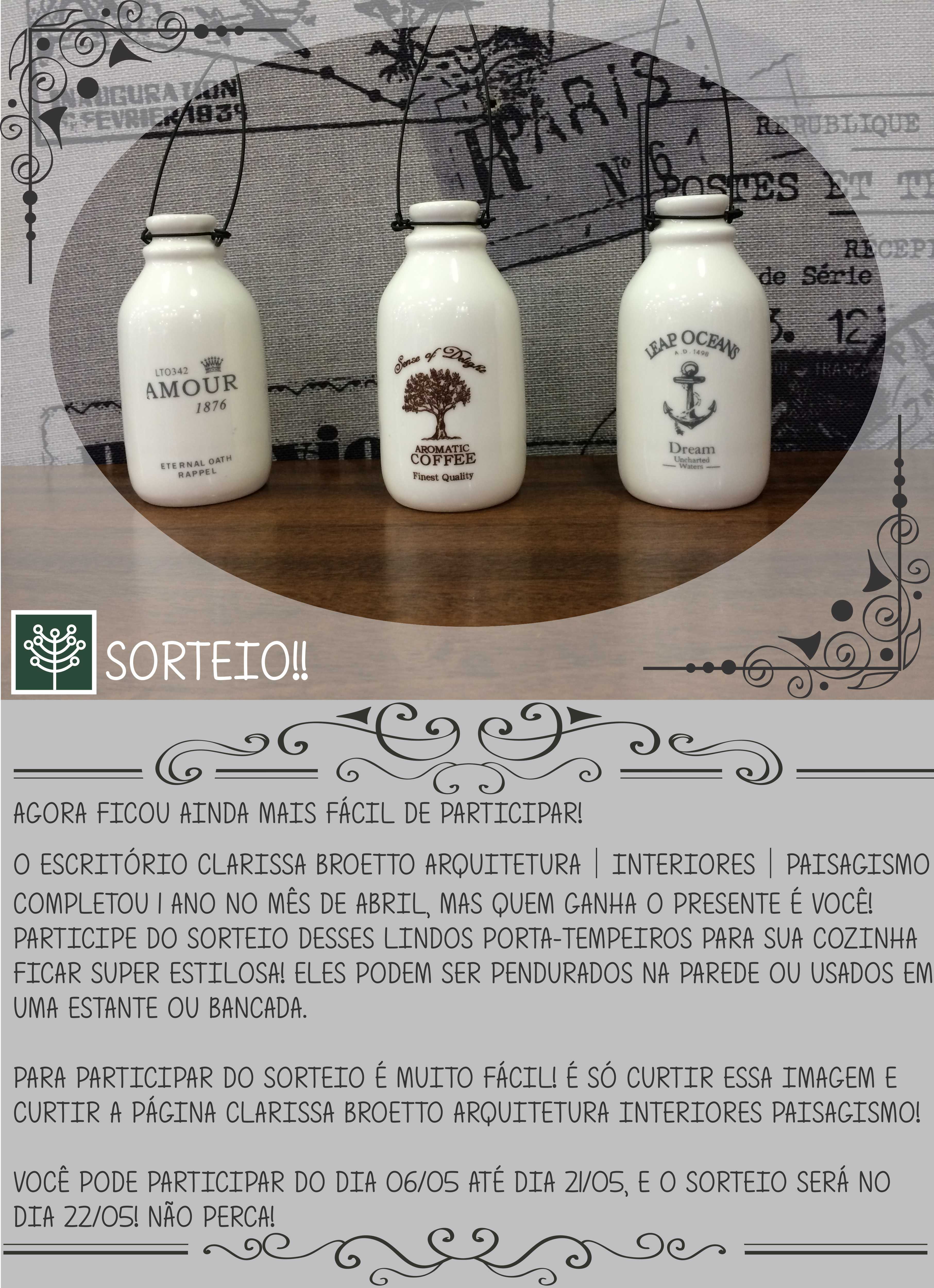 Para participar do sorteio é muito fácil! É só curtir essa imagem no Facebook https://www.facebook.com/photo.php?fbid=696602280403968&set=a.657100464354150.1073741828.656749787722551&type=1 e curtir a página Clarissa Broetto Arquitetura Interiores Paisagismo https://www.facebook.com/clarissabroettoarquiteturamaringa